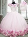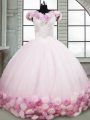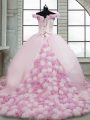 Pink Ball Gowns Fabric With Rolling Flowers Off The Shoulder Sleeveless Hand Made Flower Lace Up Ball Gown Prom Dress Brush Train