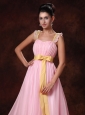 This pink prom dress is granted with new design, so it will capture your eyes! The straps with appliques embellishment forming a gorgeous sweetheart neckline on the ruched bodice to get more attention. The bowknot adorns the mid-section. The airy chiffon skirt falling from the high waist to floor. The court train trimed with the same appliques adds brilliance and splendor to the dress. The half open back with square shap show off your sexy. Such a special dress, hurry up and take action!