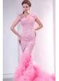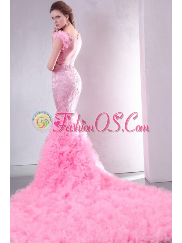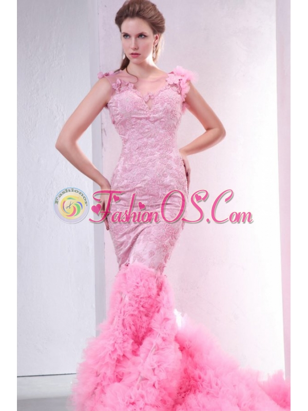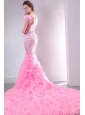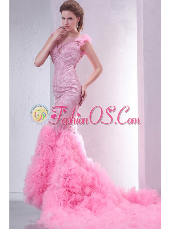 Pink Mermaid V-neck Chapel Train Wedding Dress with Beading