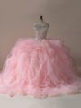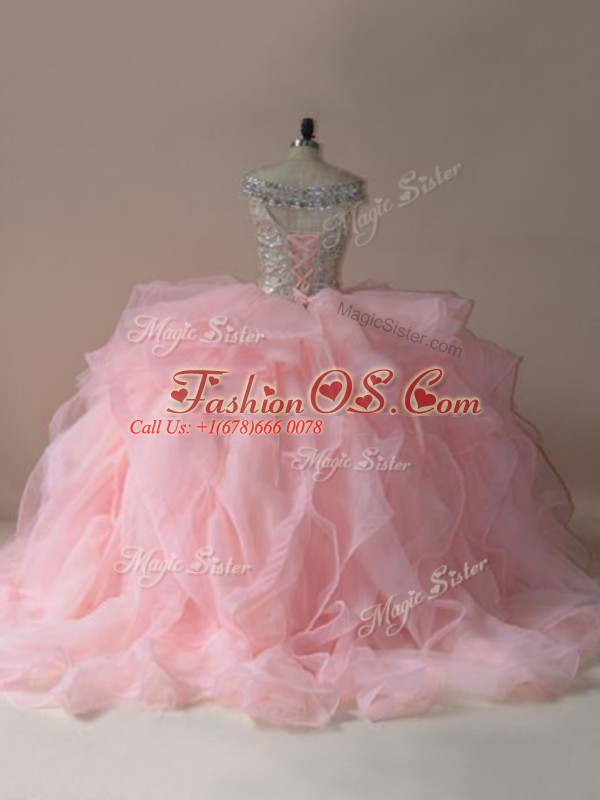 Pink Off The Shoulder Lace Up Beading and Ruffles Ball Gown Prom Dress Brush Train Sleeveless