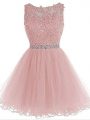 Pink Organza Zipper Scoop Sleeveless Mini Length Prom Evening Gown Beading and Lace and Appliques
