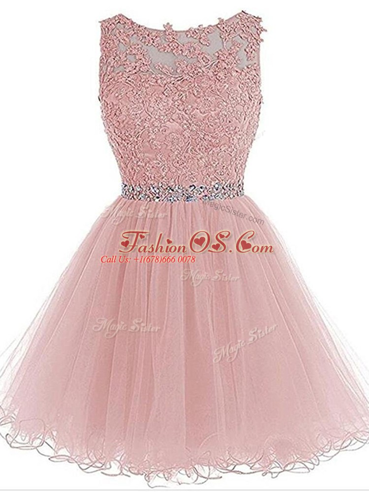 Home >  Prom Dresses >  Prom Dresses On Sale > Pink Organza Zipper Scoop Sleeveless Mini Length Prom Evening Gown Beading and Lace and Appliques