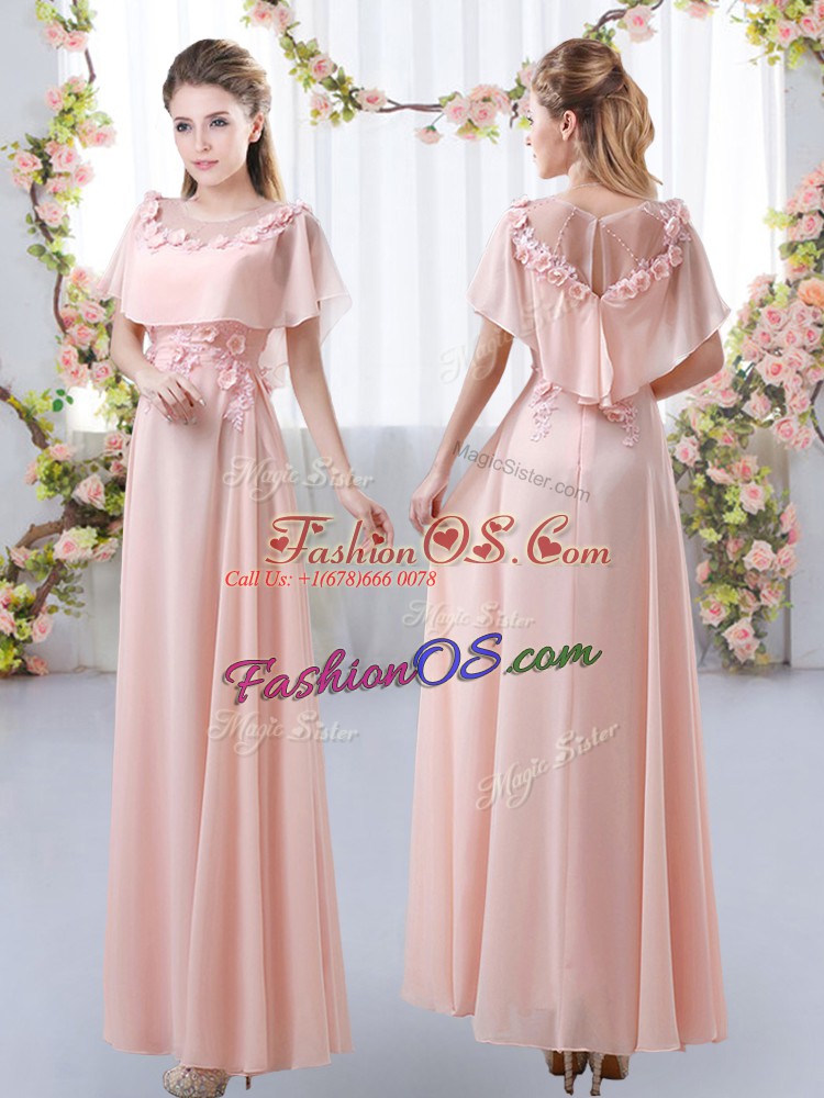 Pink Short Sleeves Floor Length Appliques Zipper Quinceanera Dama Dress