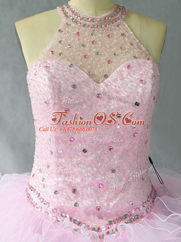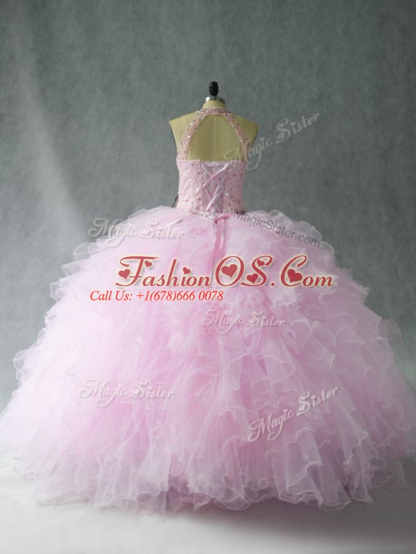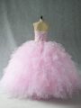 Pink Sleeveless Floor Length Beading and Ruffles Lace Up Vestidos de Quinceanera