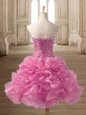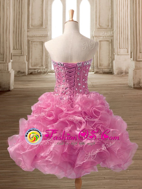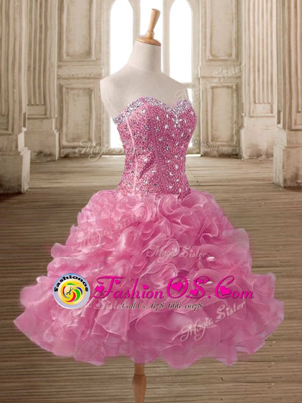 Pink Sleeveless Mini Length Beading and Ruffles Lace Up Prom Dress