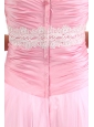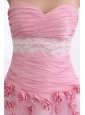 This beautiful sheath-style pink wedding dress is made from taffeta and features a lovely lace sash below the pleated bust, a sweetheart neckline and a pretty and romantic handmade rose around the midsection accents the waistline. The floor-length skirt falls in soft clean lines to the floor in multiple sheer layers, which adds to its fullness and beauty.