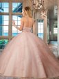 Pink Tulle Backless Halter Top Sleeveless Floor Length Quinceanera Gowns Beading and Ruffles