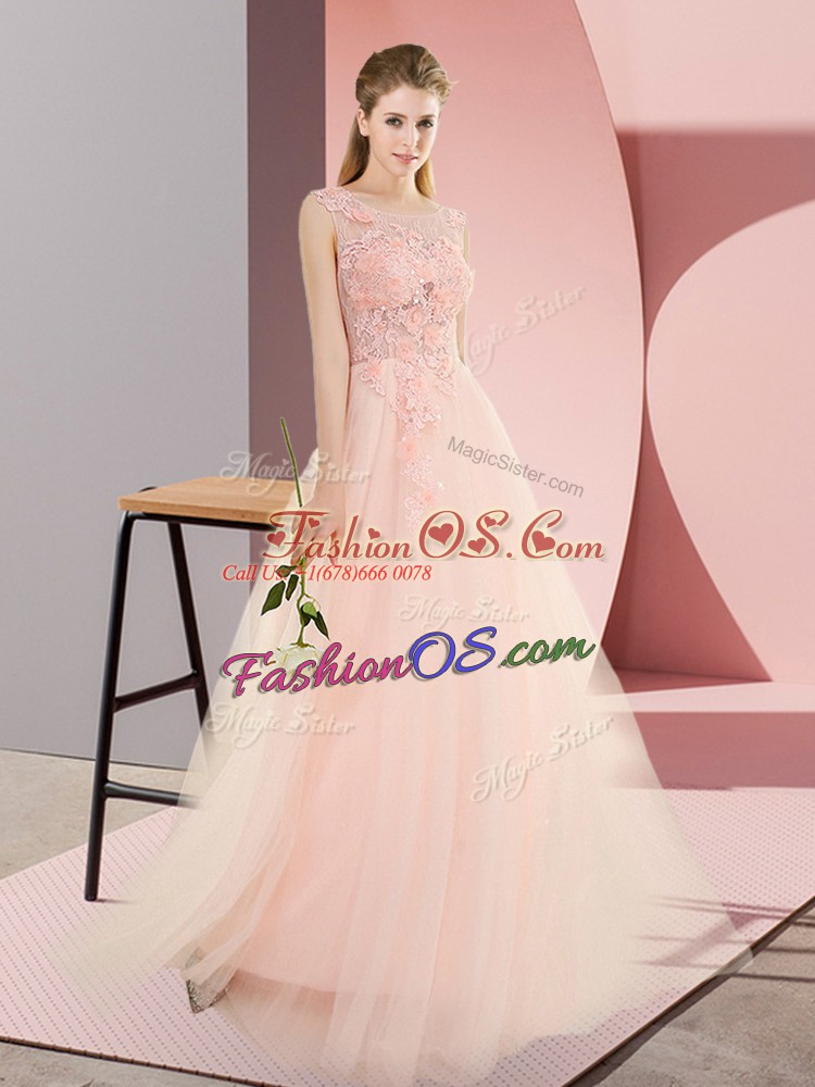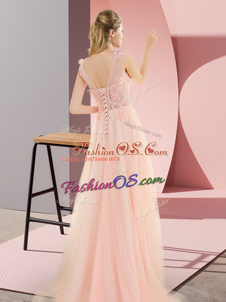 Home >  Prom Dresses >  Prom Dresses 2019 > Pink Tulle Lace Up Prom Party Dress Sleeveless Floor Length Beading and Lace and Appliques