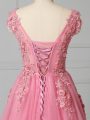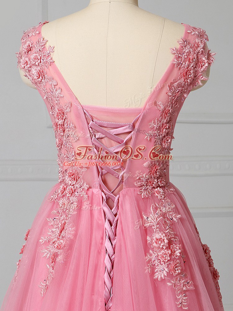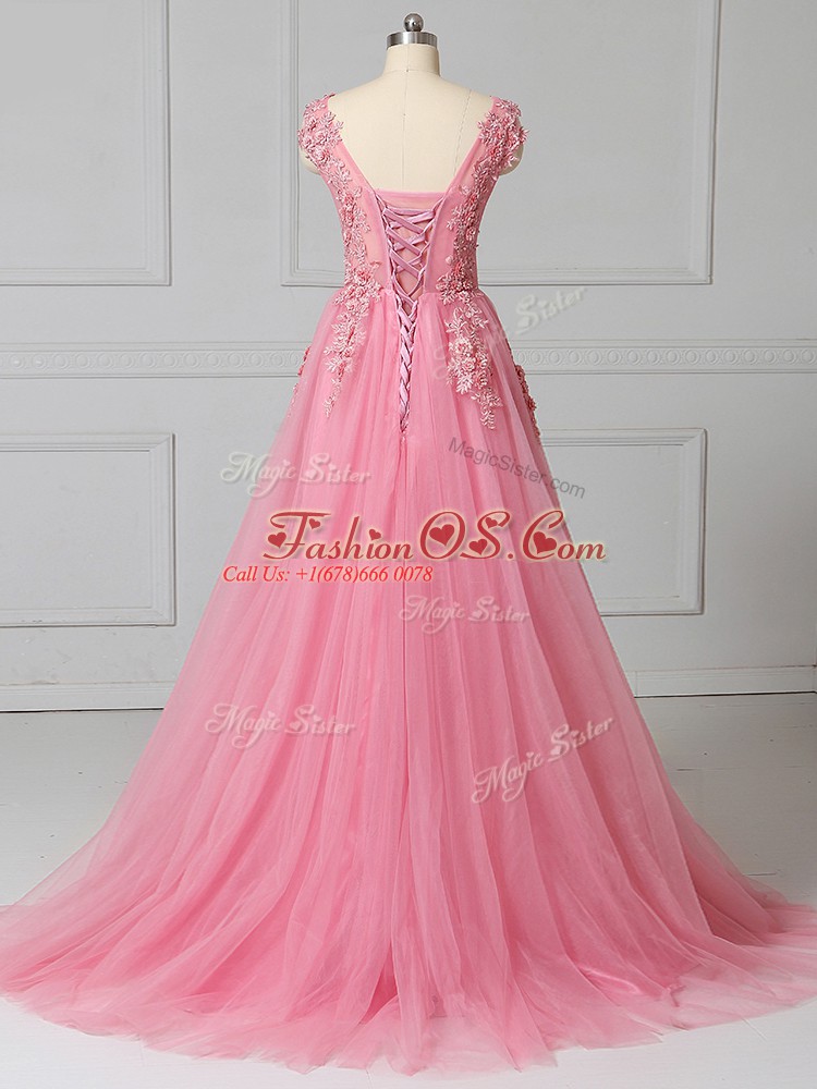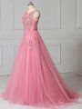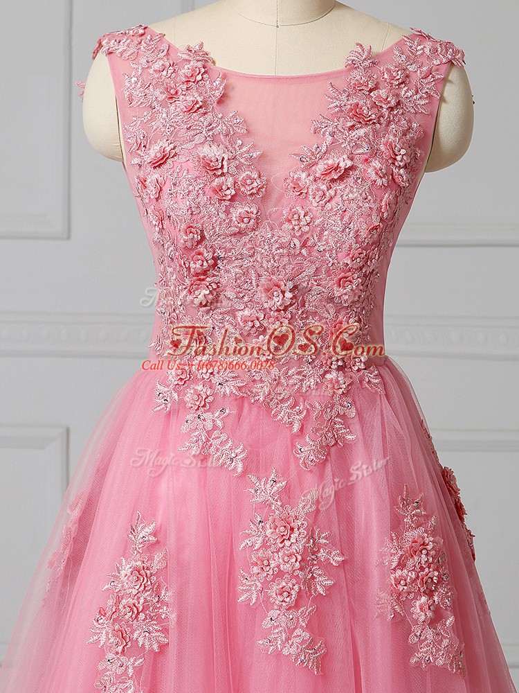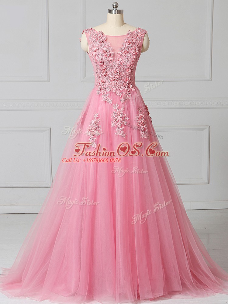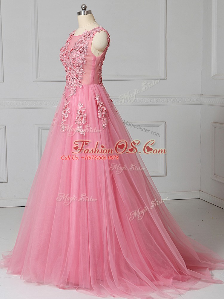 Pink Tulle Lace Up Scoop Sleeveless Prom Gown Brush Train Appliques