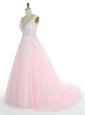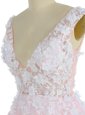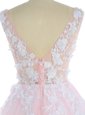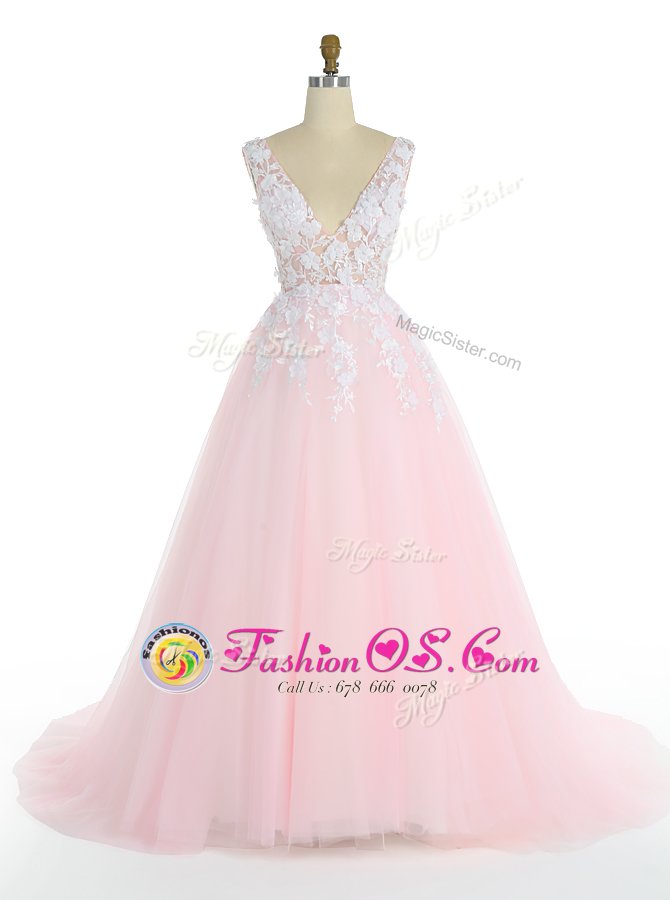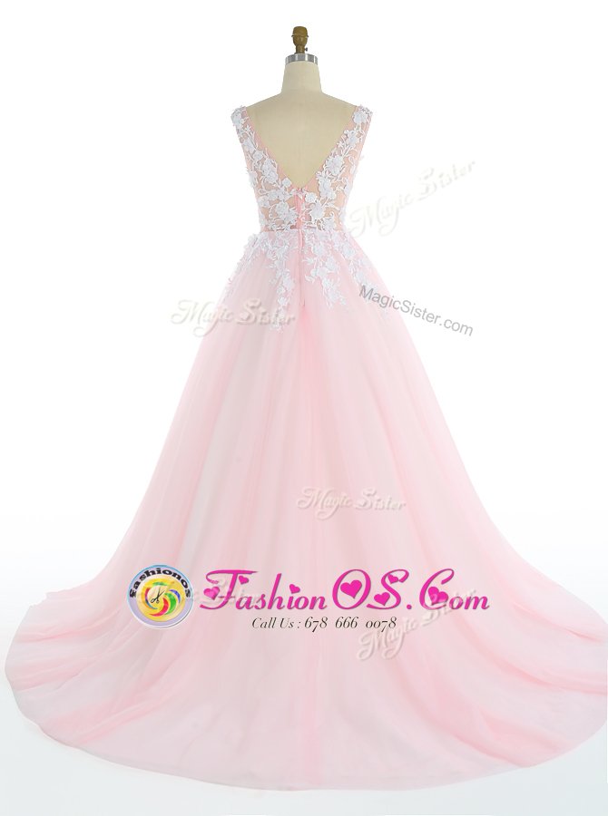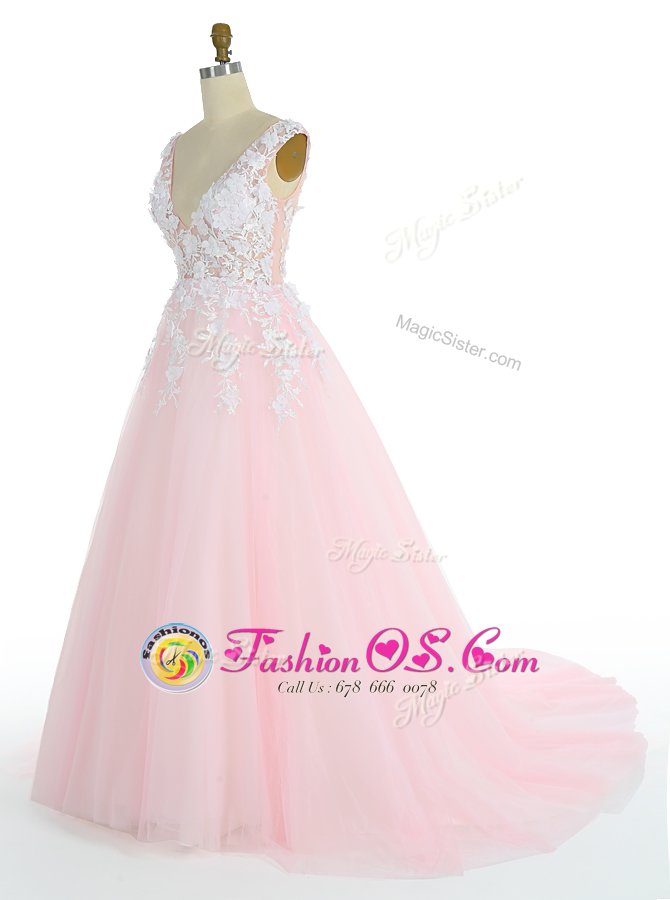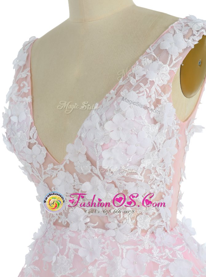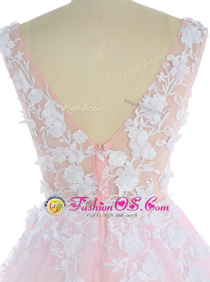 Pink V-neck Neckline Appliques Prom Dresses Sleeveless Zipper