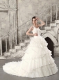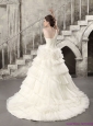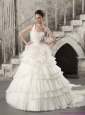 Plus Size White One Shoulder Chapel Train Wedding Dresses with Ruffled Layers