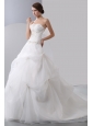 What a gorgeous weddign dress! This dress features a strapless bodice which is encrusted by the beaded floral embelishments. The scattered beading on the pleated bust and waist area makes the dress more shinning and accentuate your figure. The ruffled A-line skirt make the dress so romantic while the chapel train adds more delicate to the dress. Do you want to wow the crowd on your wedding? This dress is your best choice.