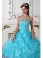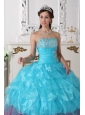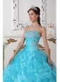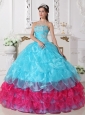 This fashional ball gown quinceanera dress is extremely attractive whenever you show up. Neat bodice is decorated by exquisite embroidery on the bust. Latest design of the skirt features a petal style. Pink and aqua organza create a difference tone when you look down to the dress. Ruched bodice also has a fitted lace up back. What a elegant and eye-catching gown!