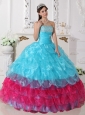 Popular Aqua Blue and Hot Pink Quinceanera Dress Strapless Organza Appliques Ball Gown