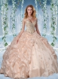 Popular Beaded Decorated Cap Sleeves Quinceanera Dress with Deep V Neck