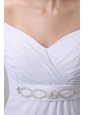This elegant floor length wedding dress is perfect for you! Soft and smooth chiffon make this dress looks simple but luxurious. It features a sweetheart neckline with a sassy sleeves. The ruched bust and a coordinating waisband accented with shimmering beading accentuate your curve. A –line floor length train gracefully falling with your slim figure makes you feel you are the fairy flying in the flowers. This gorgeous wedding dress with inspired design will open the door of beauty for you.