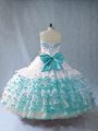 Popular Floor Length Lace Up Quince Ball Gowns Blue And White for Sweet 16 and Quinceanera with Embroidery and Ruffled Layers