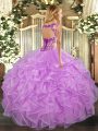 Popular Organza Scoop Cap Sleeves Lace Up Beading and Appliques and Ruffles Quinceanera Dress in Lilac