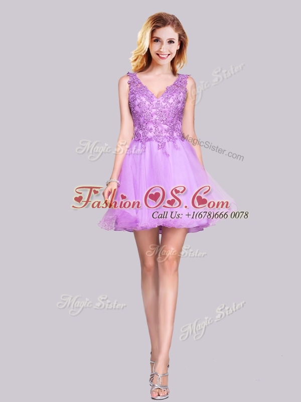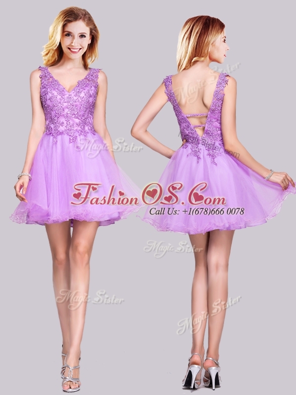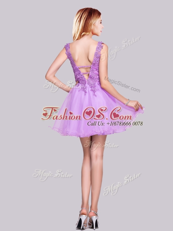 Popular V Neck Organza Backless Applique and Lace Homecoming Dress in Lilac