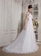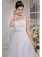 This strap lace overlay wedding dress will definitely promise you a perfect wedding.The fitted bodice has wonderful straps, the narrow waistband highlights your slim waist. The A-line skirt has a wonderful satin underlayer that adds fullness and gives the skirt its shape. The top layer of the skirt is made of lace that features more beautiful floral appliques and a gorgeous trim at the hem. The long bow in the back makes the dress perfect!