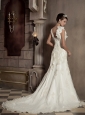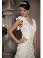 Romantic wedding gowns are always popular. They are a time-honored favorite that never goes out of style. This one is an example of what we mean. It features lovely straps, ruched bodice, a V neckline and floral embellishments on the strap. The skirt is embellished with beaded appliques that complement the floral embellishments on the shoulder strap perfectly. The scalloped edging graces the hemline. With this beautiful and gorgeous wedding dress, you will be full of elegant and gorgeous.
