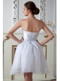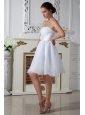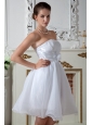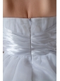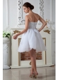 This short white prom dress will give you a great impression! The straight neckline, the ruched bust and a broad waistband adorned with a flower in blosom to outline a well-toned body. The knee-length skirt has a sheer tulle overlay with a playful wave hemline that shows off your perfect legs and shoes. You'll be the belle of the ball in this white pure ball gown!
