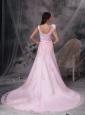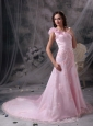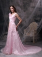 Dramatic and magnificent! This gorgeous baby pink dress will let you experience the feeling of being a unique princess and leave you a longlasting wonderful memory definitely! The V-neck style bodice is elegantly ruched and the chic roses in the shoulder is so fabulous to show your beauty. The stunning floor length skirt with sophiscated appliques adds more elegance to create a beautiful court train. A lace up corset style closure in the back secures the dress in place and completes this wonderful design.