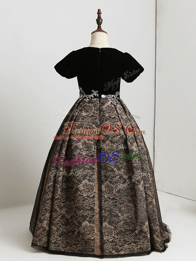 Pretty Black Zipper Scoop Appliques Kids Pageant Dress Lace Short Sleeves