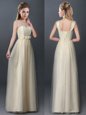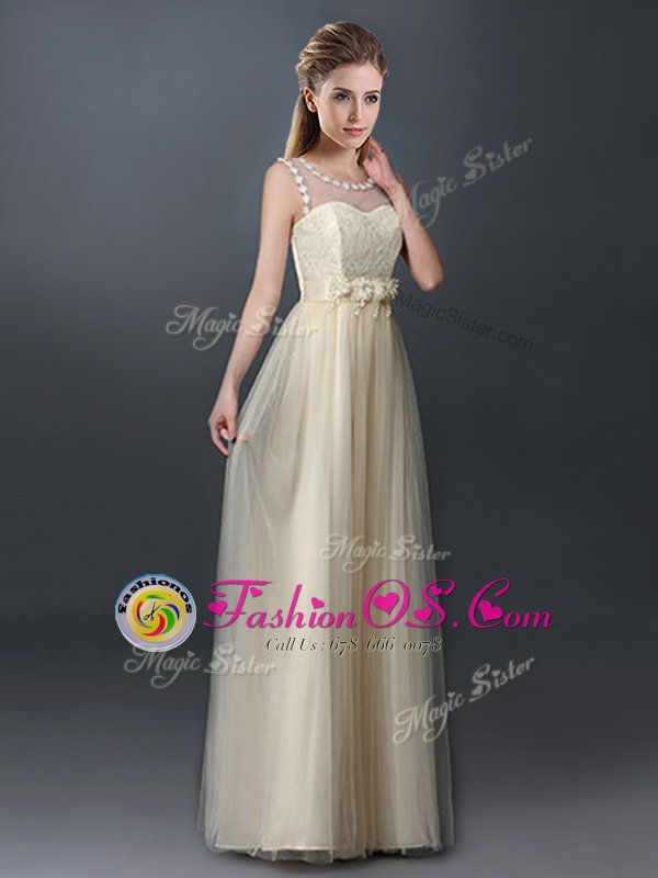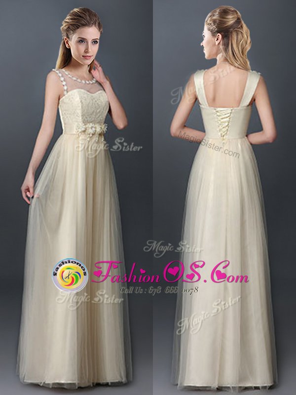Pretty Champagne Empire Scoop Sleeveless Tulle Floor Length Lace Up Lace and Hand Made Flower Dama Dress
