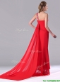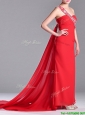 Pretty Column One Shoulder Watteau Train Chiffon Coral Red Prom Dress with Beaded