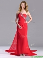 Home >  Prom Dresses >  Christmas Party Dresses > Pretty Column One Shoulder Watteau Train Chiffon Coral Red Prom Dress with Beaded