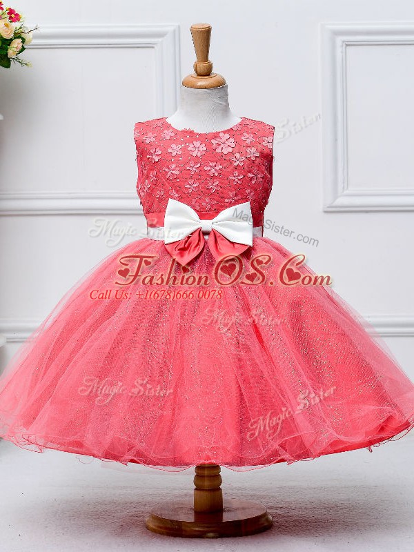 Pretty Coral Red Tulle Zipper Little Girls Pageant Dress Wholesale Sleeveless Knee Length Lace and Bowknot