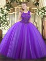 Pretty Eggplant Purple Ball Gowns Tulle Scoop Sleeveless Beading Floor Length Zipper Quince Ball Gowns