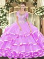 Pretty Floor Length Clasp Handle Ball Gown Prom Dress Lilac for Military Ball and Sweet 16 and Quinceanera with Beading and Ruffled Layers