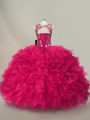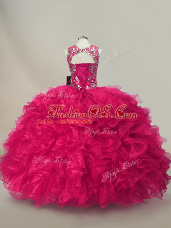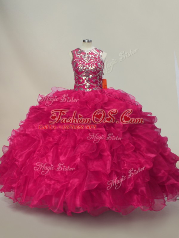 Pretty Hot Pink Ball Gowns Organza Sweetheart Sleeveless Ruffles and Sequins Floor Length Lace Up Sweet 16 Dresses