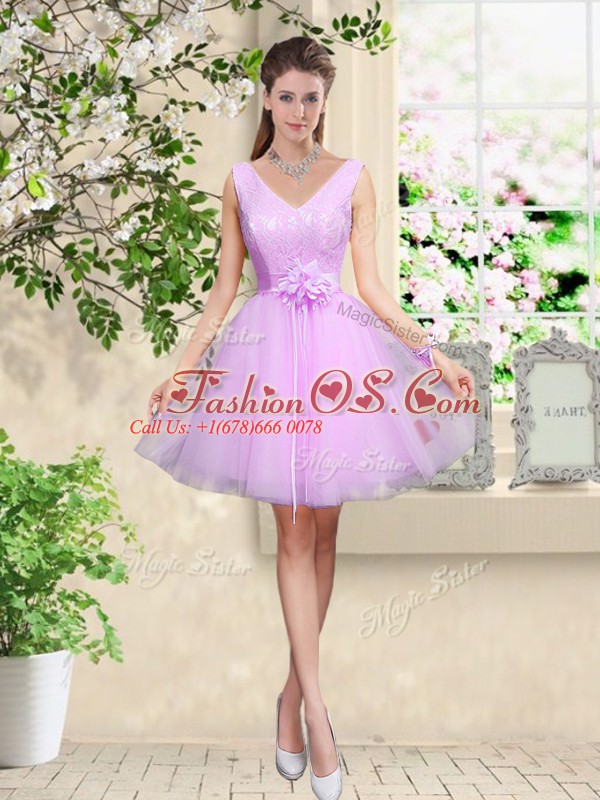 Pretty Lilac Lace Up Bridesmaid Gown Lace and Belt Sleeveless Knee Length