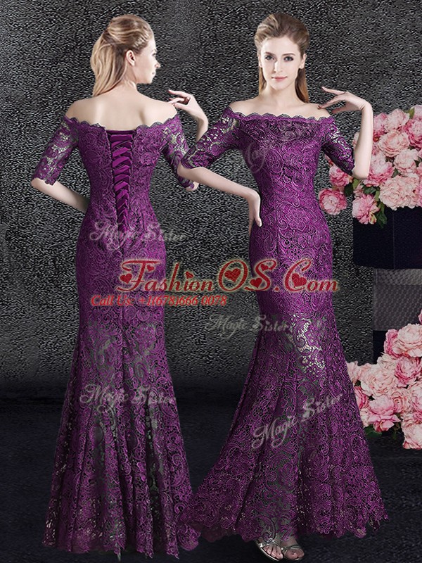 Pretty Mermaid Off the Shoulder Floor Length Lace Up Mother Of The Bride Dress Purple for Prom and Party with Lace