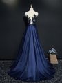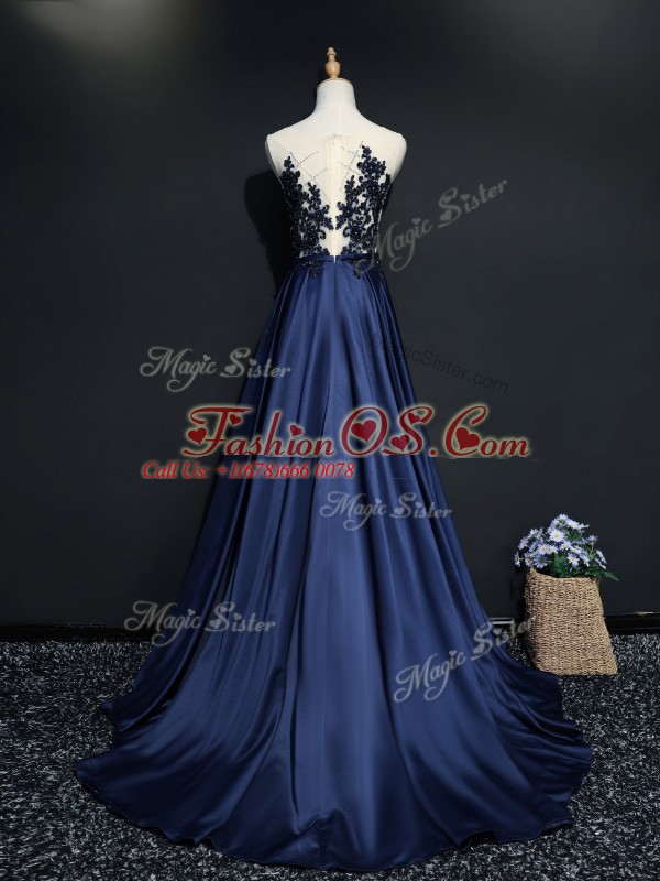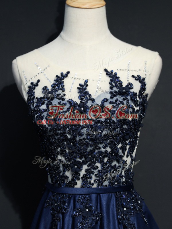Home >  Prom Dresses >  Fashionable Prom Dresses > Pretty Navy Blue Empire Taffeta Scoop Sleeveless Beading and Appliques Zipper Brush Train
