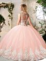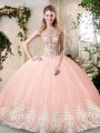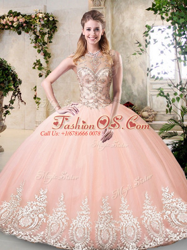 Pretty Peach Tulle Backless Sweet 16 Dress Sleeveless Floor Length Beading and Appliques