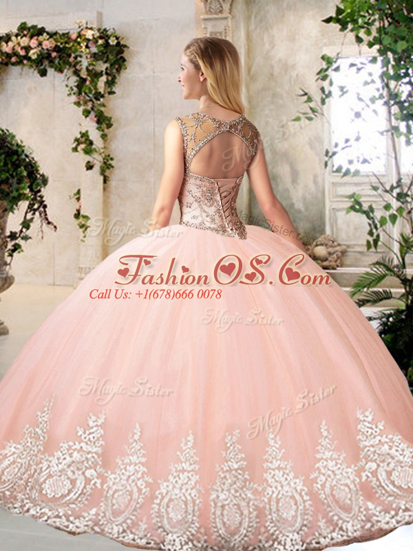 Home >  Quinceanera Dresses >  Quinceanera Dresses 2018 > Pretty Peach Tulle Backless Sweet 16 Dress Sleeveless Floor Length Beading and Appliques