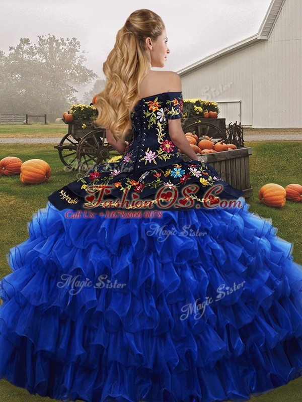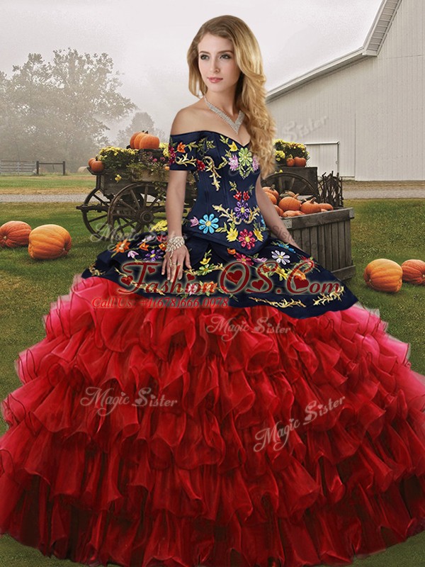 Pretty Red And Black Sleeveless Floor Length Embroidery and Ruffled Layers Lace Up Quince Ball Gowns