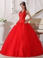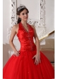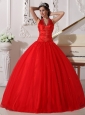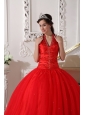 Pretty Red Quinceanera Dress Halter Tulle Beading Ball Gown