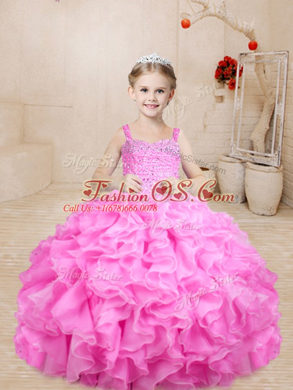 Home >  Special Occasion Dresses >  Beautiful Kids Pageant Dresses > Pretty Rose Pink Straps Neckline Beading and Ruffles Evening Gowns Sleeveless Lace Up