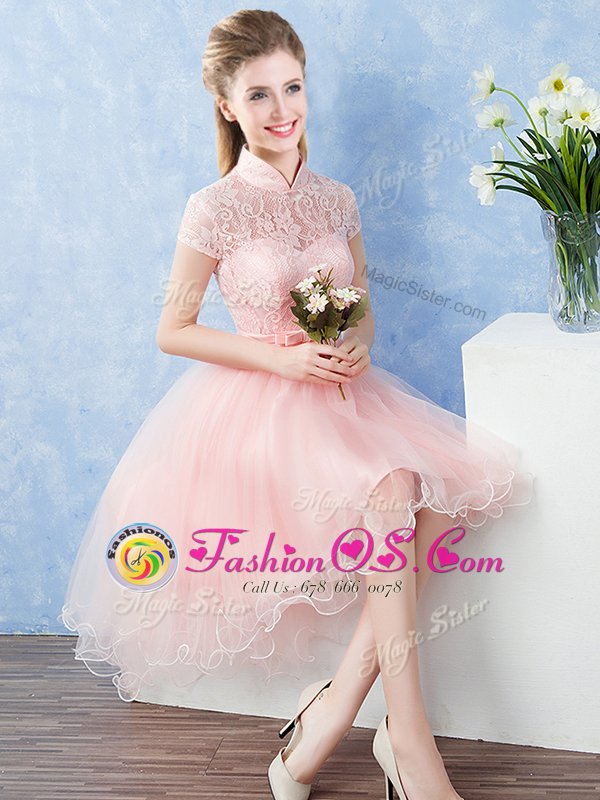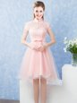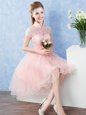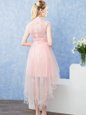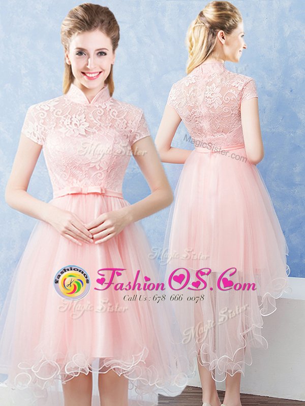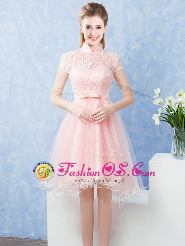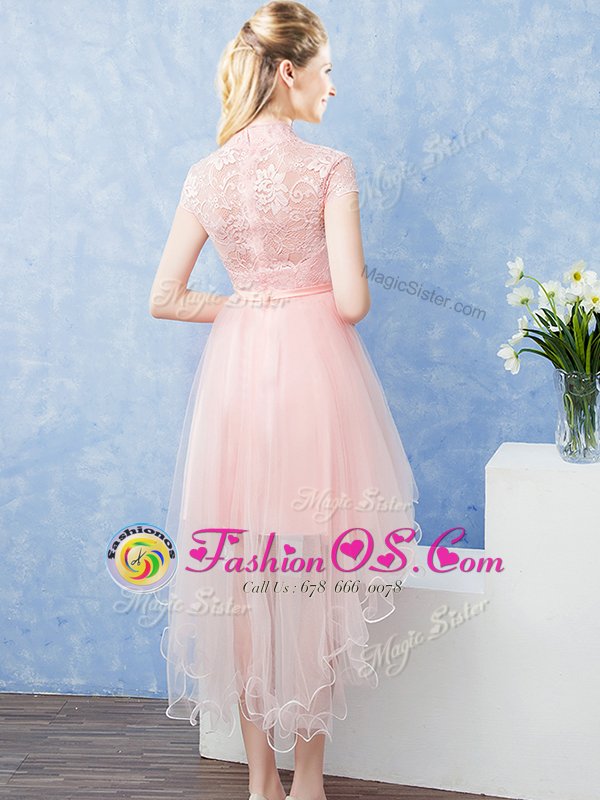 Pretty Short Sleeves Tulle High Low Zipper Quinceanera Dama Dress in Baby Pink for with Lace and Belt