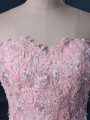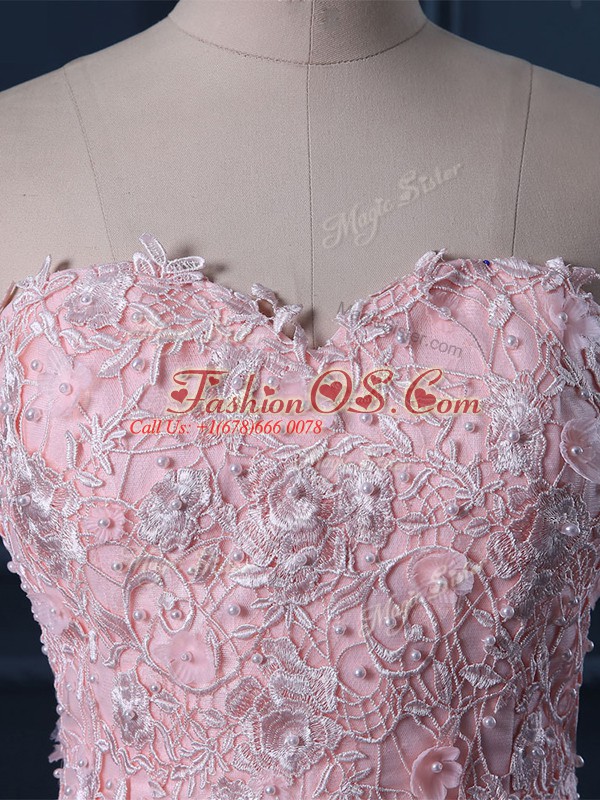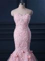 Pretty Sleeveless Appliques and Hand Made Flower Lace Up Prom Gown with Baby Pink Brush Train