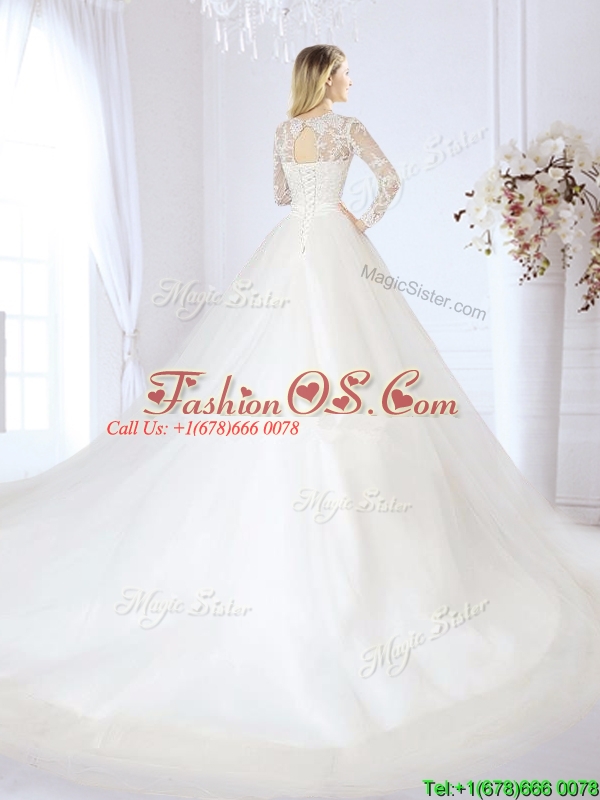 Home >  Wedding Dresses >  Romantic Wedding Dresses > Pretty V Neck Beaded and Laced Wedding Dress with Chapel Train