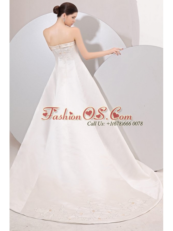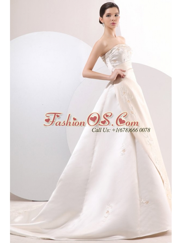 Princess Strapless Court Train Satin Champagne Wedding Dress with Embroidery