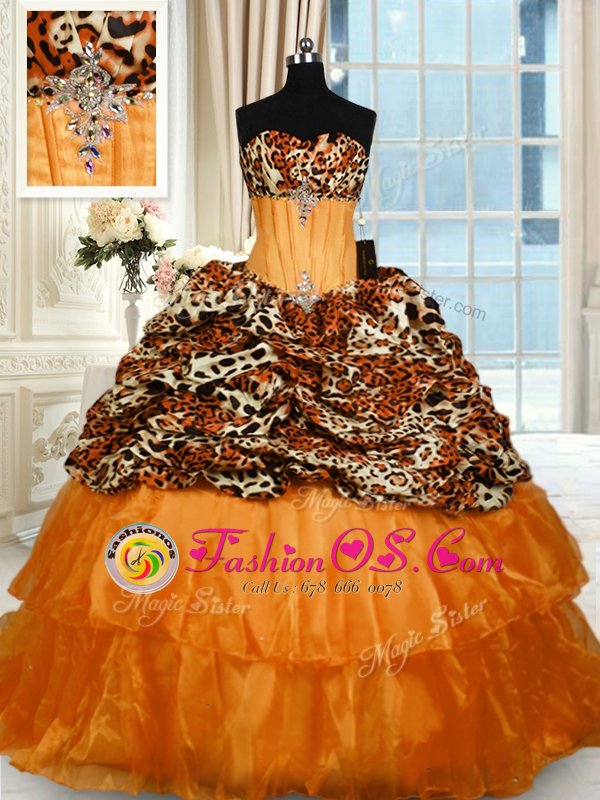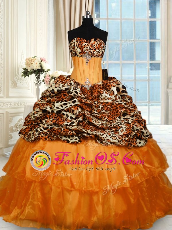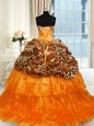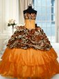 Home >  Quinceanera Dresses >  Cheap Quinceanera Dresses > Printed Orange Strapless Lace Up Beading and Ruffled Layers Quinceanera Dress Sweep Train Sleeveless