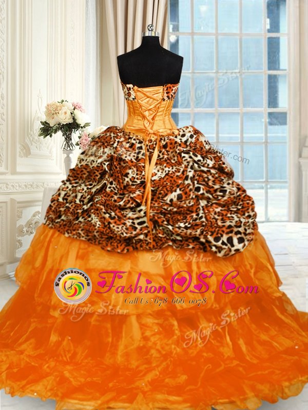 Printed Orange Strapless Lace Up Beading and Ruffled Layers Quinceanera Dress Sweep Train Sleeveless