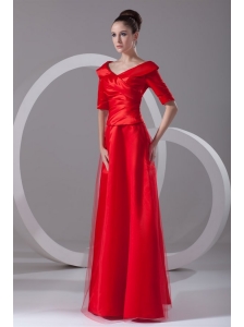 Cheap Column V-neck Red Taffeta Half Sleeves Red Ruching Prom Dress